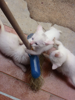 Sie hat 3 kleine Babykatzen, welche die Eltern mit der Flasche groß ziehen, da die Katzenmutter bei der Geburt gestorben ist. Obwohl eine der Katzen unbedingt auf meinen Schoss springen und mir mit ihren Krallen ein paar Striemen verpassen musste (wer hat auch im Winter einen Rock an...), waren die Katzen voll witzig und süss.